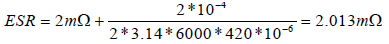 由于直流濾波電容上的紋波電流主要是2倍開關(guān)頻率(6kHz)次諧波,因此可以計算得到電容的等效串聯(lián)電阻為: