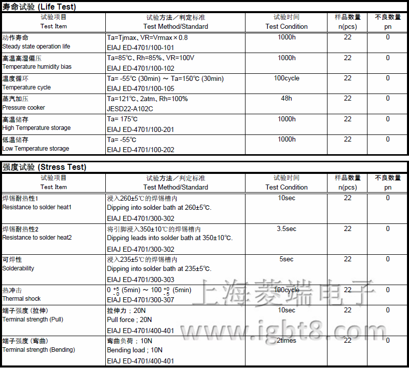 樣品標(biāo)準(zhǔn):采用可靠性水平90%,故障失效水平λ1=10%,C=0的判定,根據(jù)MIL-STD-19500的指數(shù)分布型計數(shù)一次抽樣表,采用22個樣本。